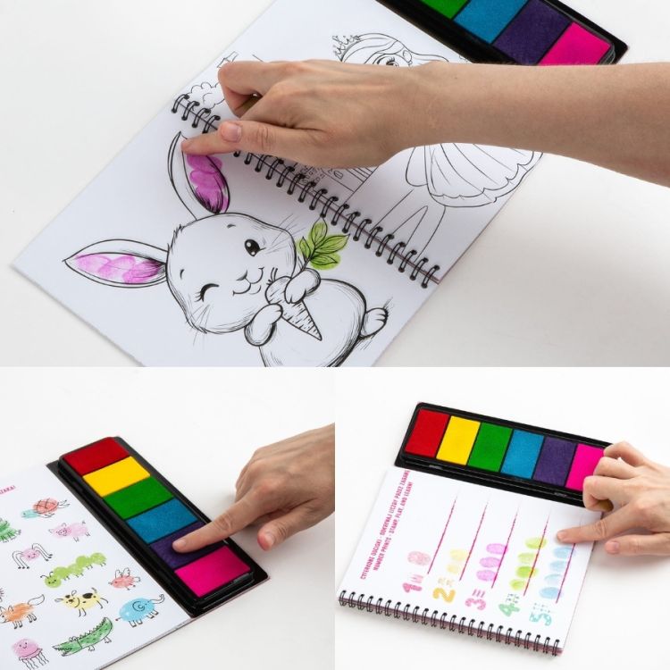 Vyberte si vzor z knihy, který chcete vyplnit – na naučných stránkách se můžete naučit počítat, velmi snadno vytvořit mazlíčka pomocí otisků prstů nebo vybarvit jeden z obrázků uvnitř. Několikrát poklepejte na houbičku s barvou dle vlastního výběru, můžete také položit prst na několik houbiček a smíchat barvy dohromady a vytvořit tak nové odstíny.