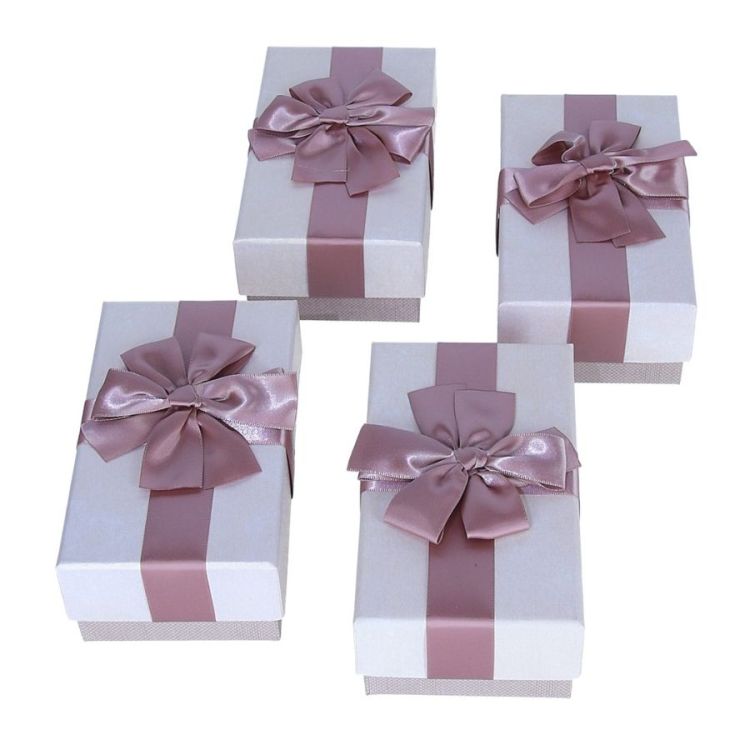 Dárková krabička s perlťovými odlesky a saténovou mašlí.