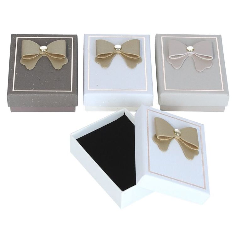 Víčko krabičky je s krásnou třpytivou úpravou, se zlatým lemem na okraji a je ozdobeno koženkovou mašlí.