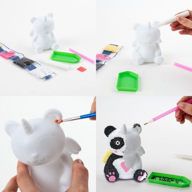 1. Nejprve postupně nanášejte lepidlo na vybraná místa figurky, poté zvolte barvu diamantů a nasypte je na přiložený tácek.