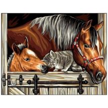Motiv: kůň ve stáji s hříbátkem a kočičkou
