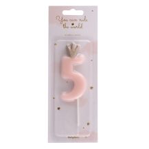 Růžová dortová svíčka ve tvaru číslice se zlatou, glitrovou korunkou.