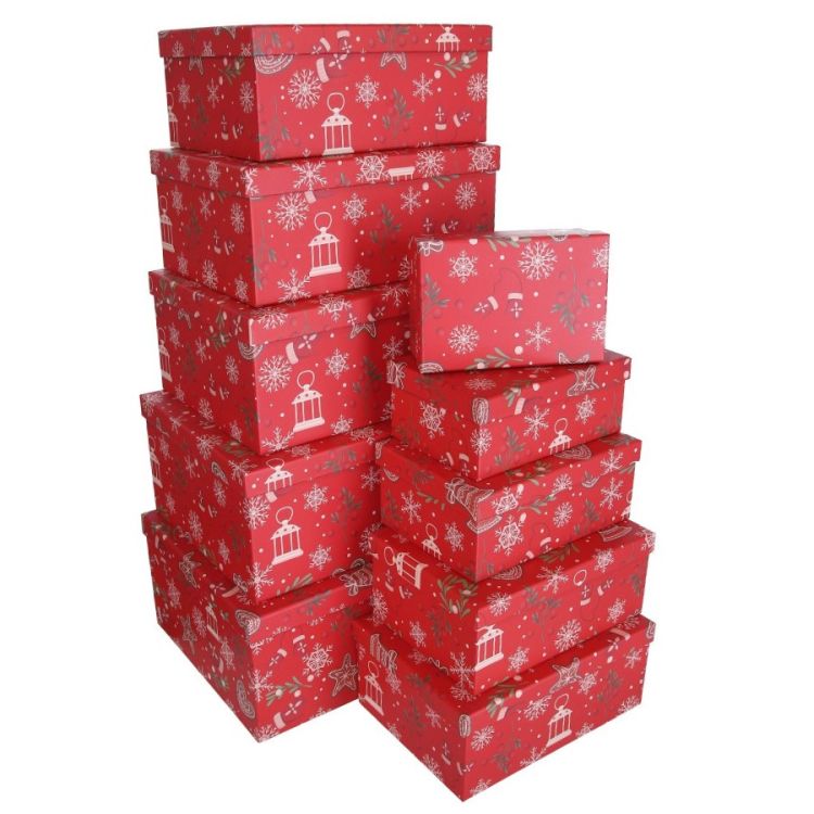 Krabičky jsou červené, víko je ozdobené potiskem vánoční hvězdy.