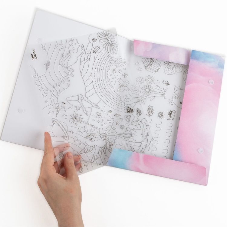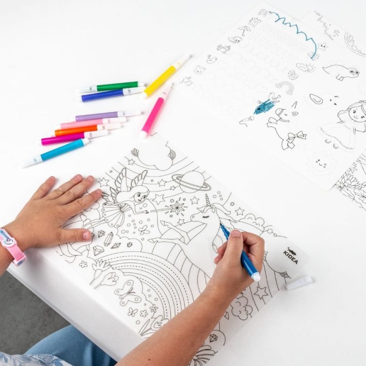Složka obsahuje 6 křídových fixů v praktickém obalu, 3 stírací tabule a 4 papírové karty nabízejí širokou škálu možností: prázdnou tabuli pro volné kreslení, vzory s cestami a kresbami pro výuku psaní a procvičování motoriky ruky a hotové motivy k vybarvování.