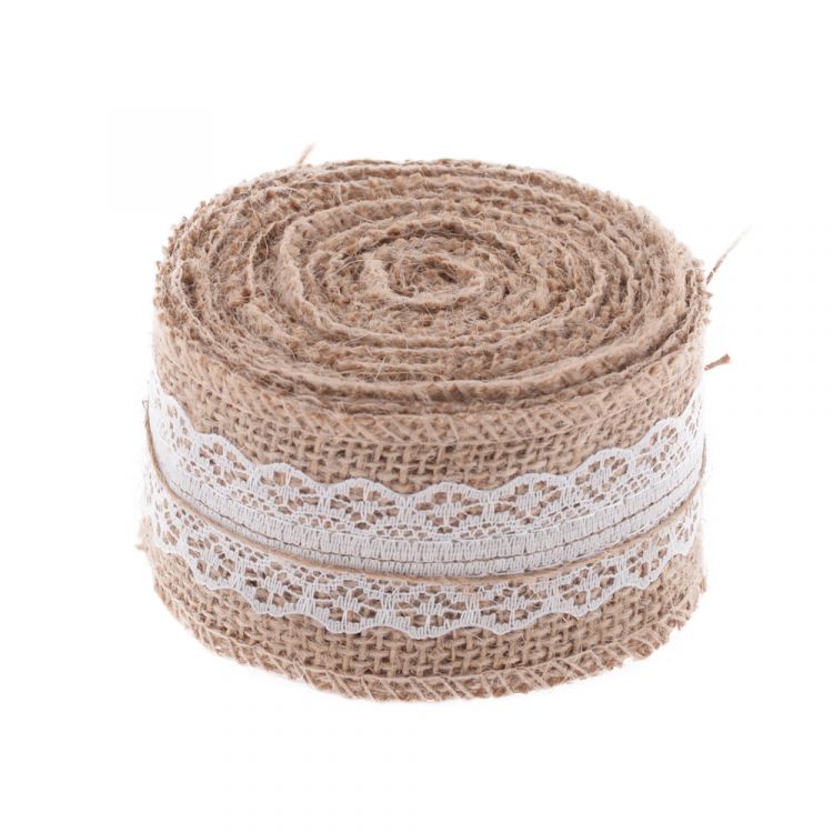 Dekorační materiál - juta v roli s bílou krajkou na středu a s obšitými okraji.