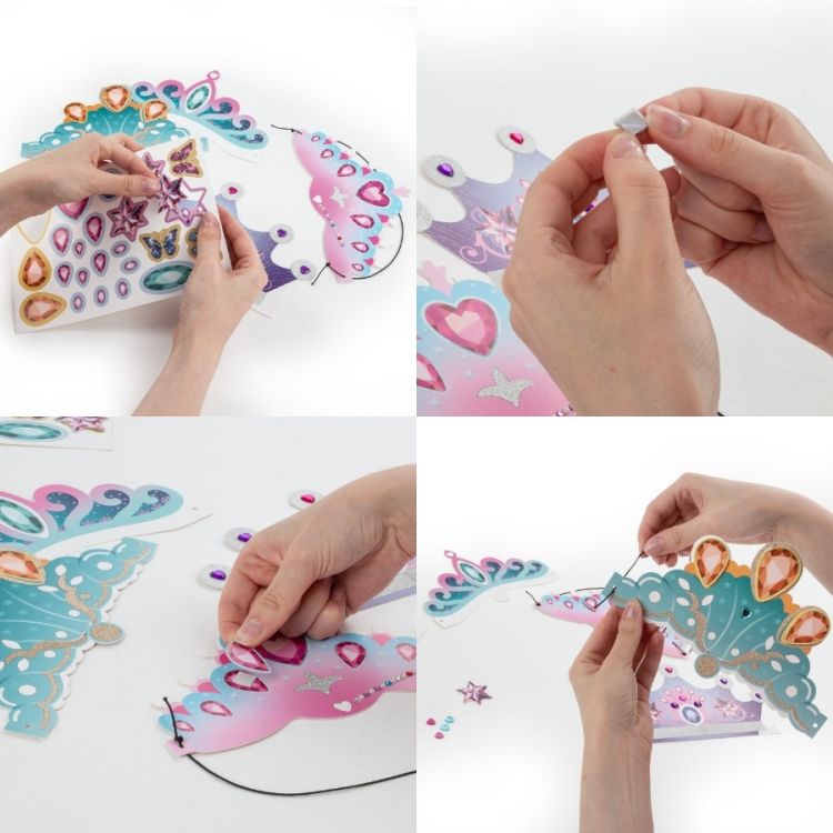 Sada obsahuje krásné korunky, které lze ozdobit třpytivým papírem, samolepkami a lesklými diamanty.