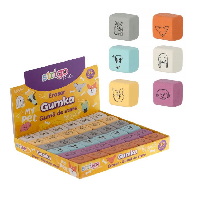 Mazací pryž Strigo s obrázkem zvířátek v různých barvách.