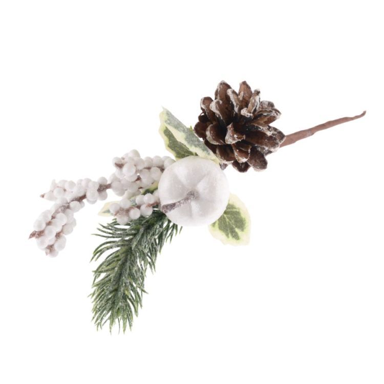 Umělá dekorační přízdoba v podobě větvičky s glitry, která se skládá ze smrku, lístků, šišky, bílého jablíčka a bobulí.