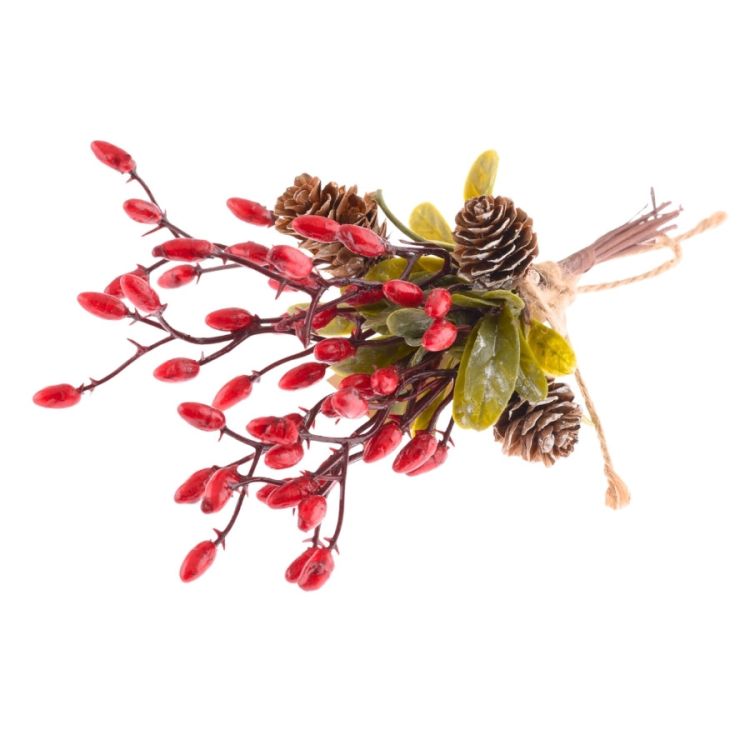 Dekorační větvička s červenými plody s lístky a šiškami.