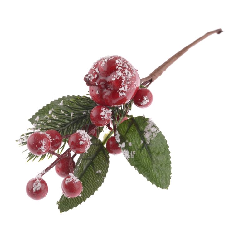 Umělá dekorační přízdoba v podobě zasněžené větvičky, která se skládá ze smrku, lístků, červeného jablíka a bobulí.