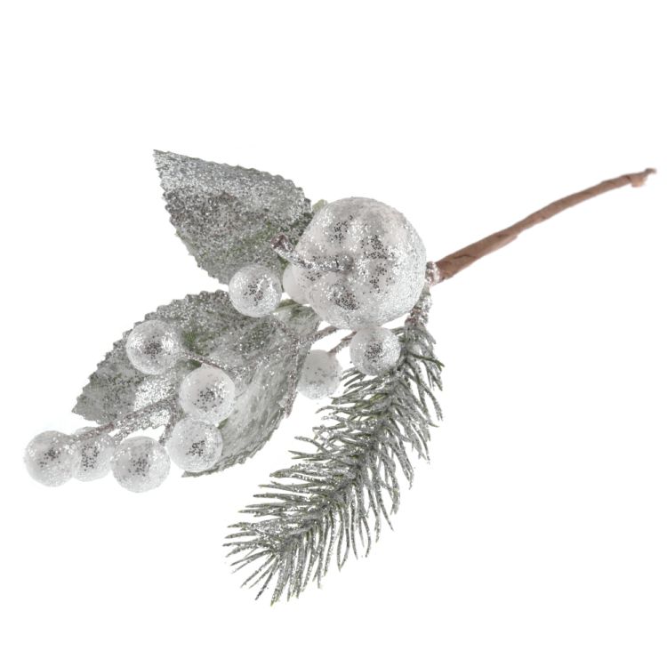 Umělá dekorační přízdoba v podobě větvičky se stříbrnými glitry, která je složena ze smrku, bílého jablíčka, bobulí a lístků.