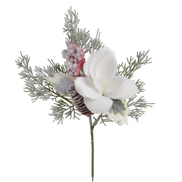 Dekorační zasněžená větvička s bílou magnolií, s šiškou a bobulkami.