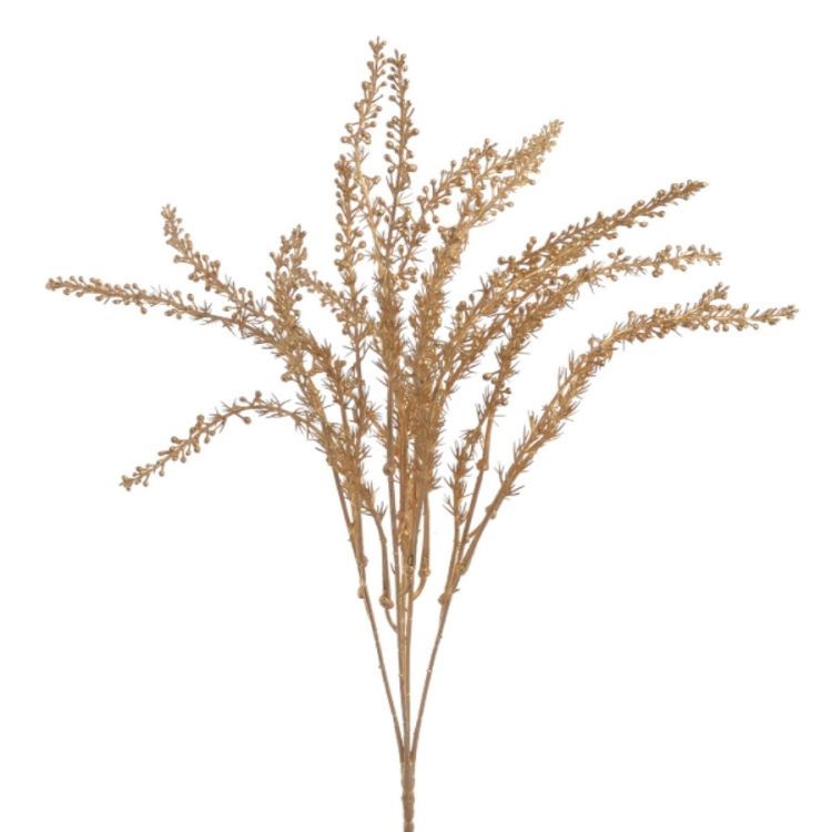 Větvička s drobnými bobulkami a jehličím ve zlaté barvě.