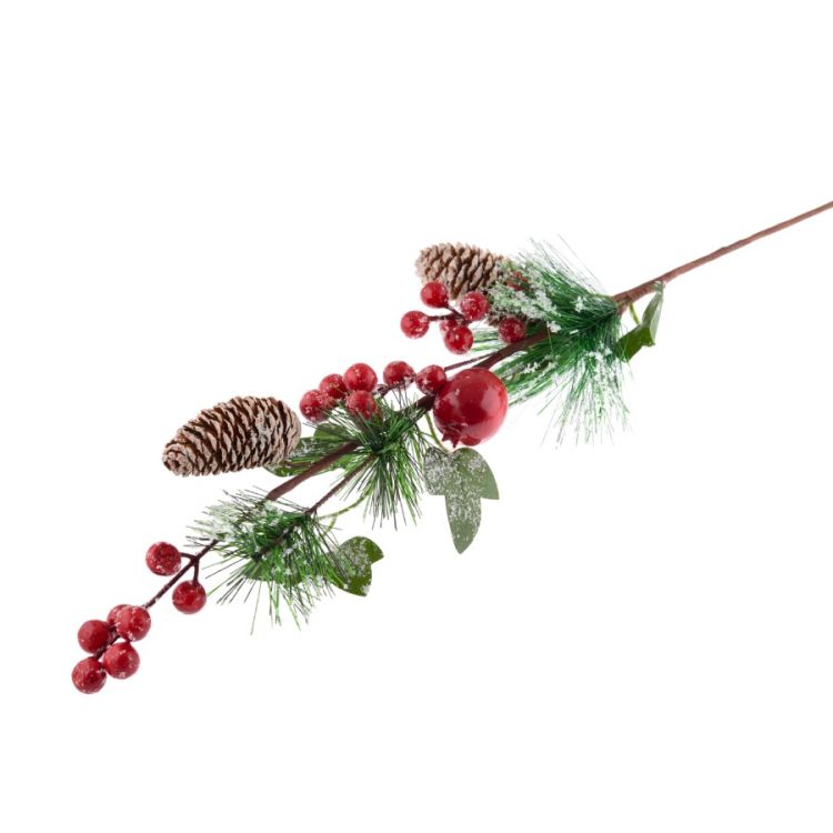 Dekorační větvička borovice s červenými bobulemi a šiškami.