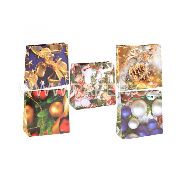 Vánoční dárková taška s potiskem a se zlatými prvky.