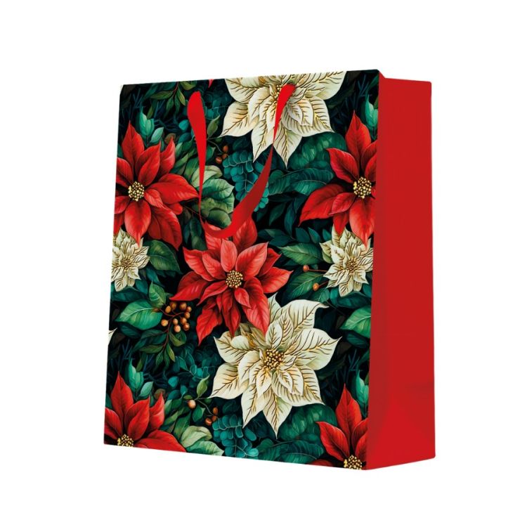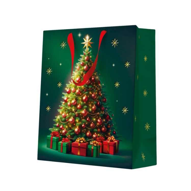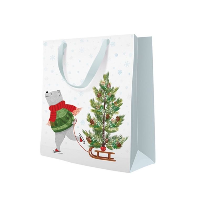 Dárková papírová taška s vánočním motivem a s průzorem.