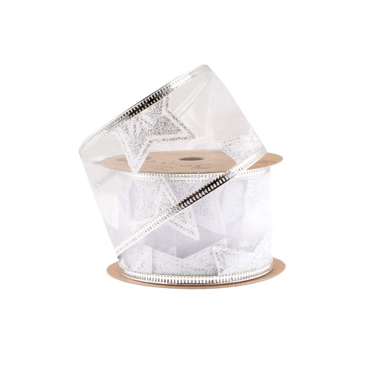 Vánoční stuha imitace juty s potiskem vloček se stříbrnými glitry.