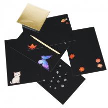 V sadě najdete 5 listů s obrázky (z jedné strany pro vyškrábání a z druhé strany pro použití barevné fólie), 10 dekor.fólií a škrabací pero z bambusu.