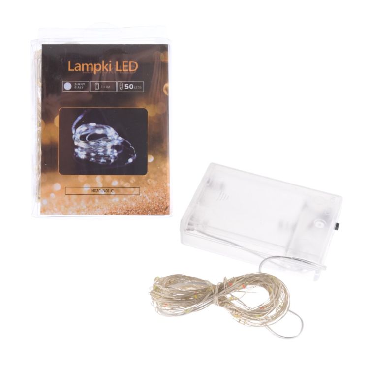 Dekorační svítící řetěz z malých LED diod s bílým, studeným světlem na stříbrném drátku.