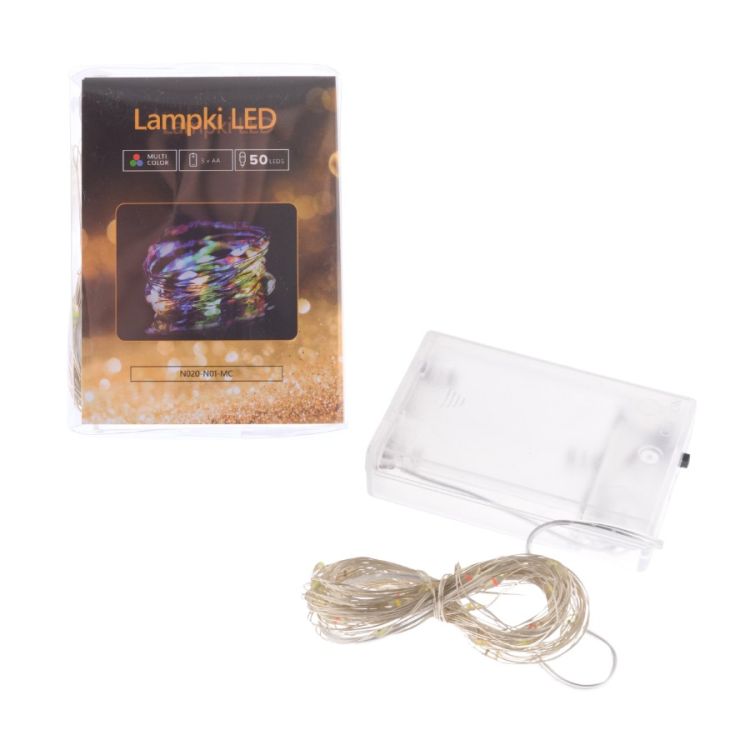 Dekorační svítící řetěz z malých LED diod s barevným světlem na stříbrném drátku.