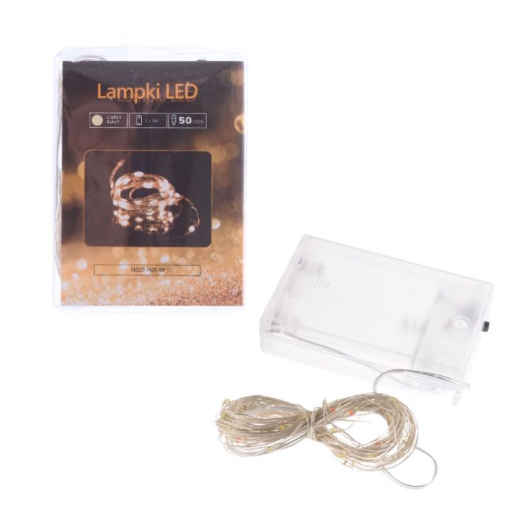 Dekorační svítící řetěz z malých LED diod s bílým, teplým světlem na stříbrném drátku.