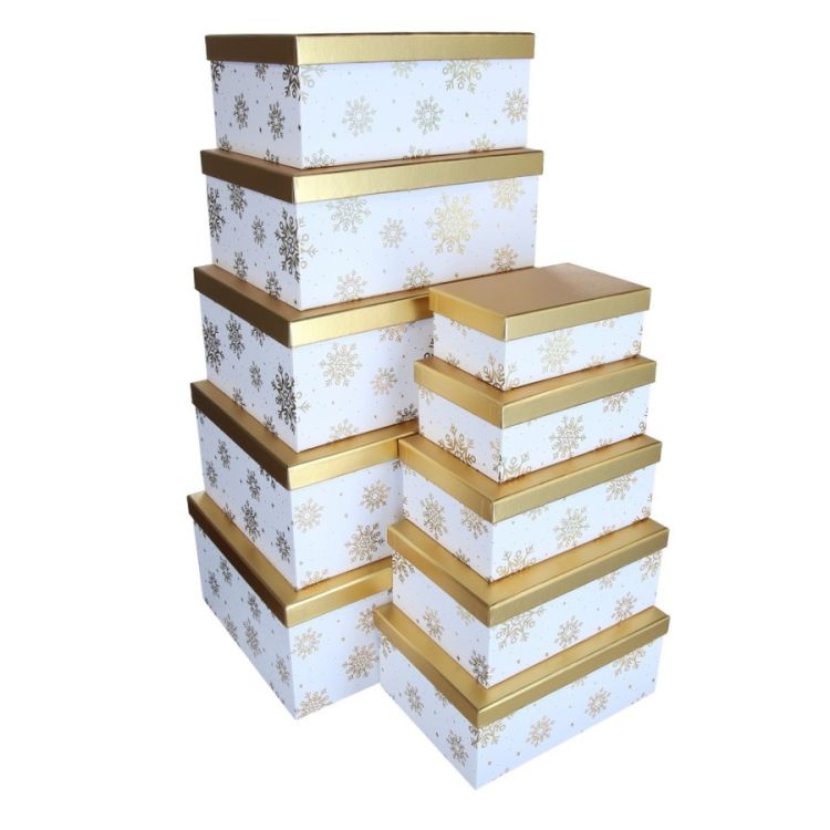 Krabičky jsou bílé se zlatými potiskem vloček a se zlatým víkem.