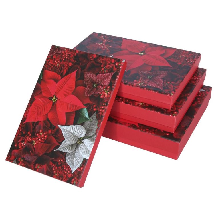 Krabičky jsou červené, víko je ozdobené potiskem vánoční hvězdy.